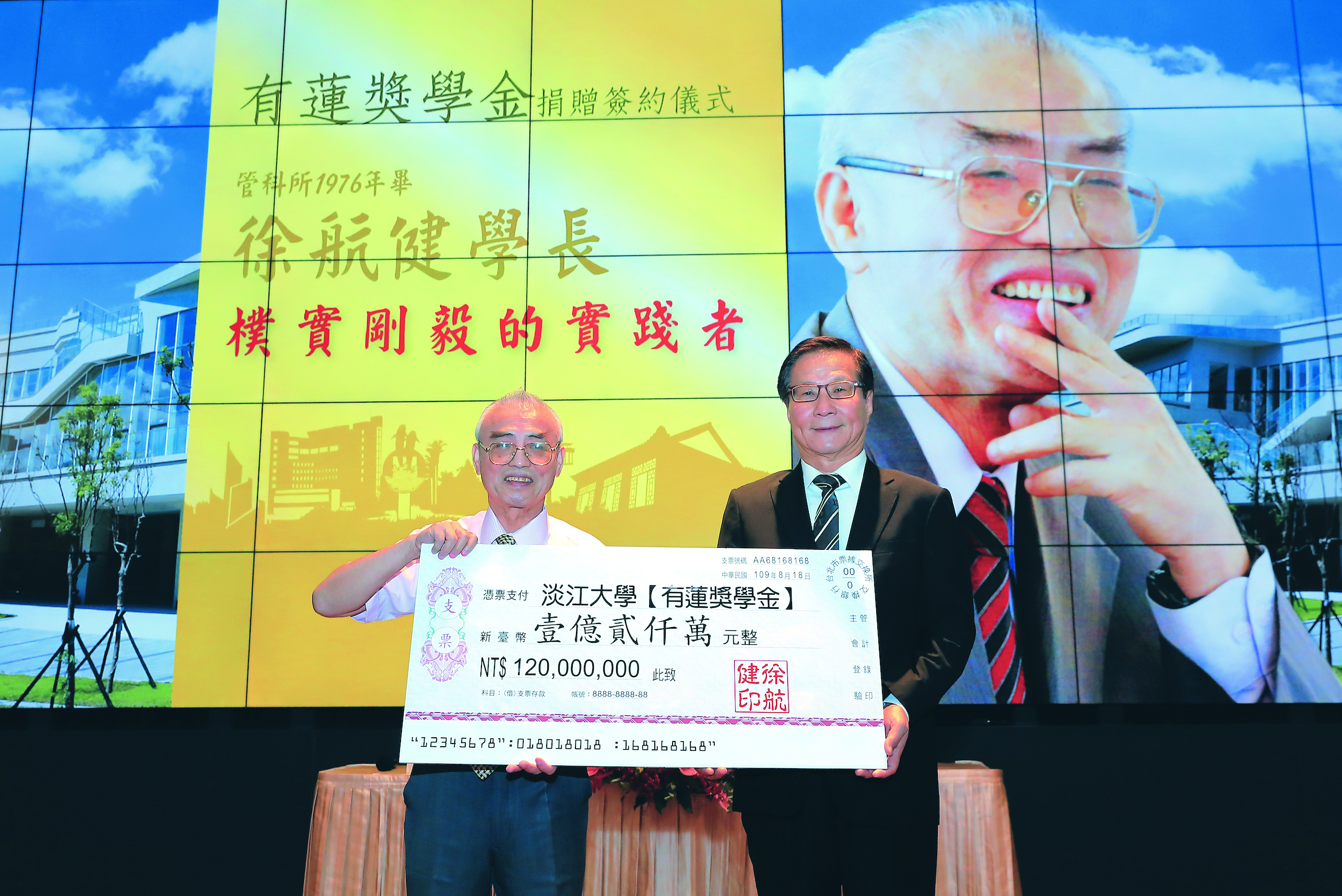 ◎校友徐航健(左)捐款成立有莲奖学金,嘉惠入学新生 (转自淡江时报)