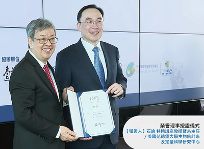 統計系金鷹校友石瑜,因在生物統計及大數據應用於生醫領域上的學術成就,榮任台灣人體生物資料庫學會「榮譽理事」頭銜,日前在該學會年會由前副總統陳建仁親自頒贈證書。該學會將借重石瑜在美國推動相關學術的豐富經驗,建立臺灣的人體生物資料庫,石瑜也分享美國醫學大數據的最新發展。