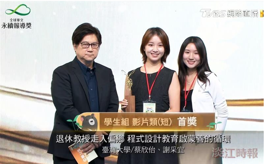由TVBS信望愛永續基金會主辦的《第8屆全球華文永續報導獎》頒獎典禮,於 10 月 6日(日)盛大舉行,本報前記者,英文系校友,現就讀臺灣大學新聞研究所的謝采宜,以《退休教授走入偏鄉—程式設計教育啟蒙善的循環》獲得學生組短影片類首獎。大傳四簡銘志及戴上恩,則以《浪板再生,永續的浪人精神》,拿下同組影片優等獎,分別從頒獎人,大傳系傑出校友、TVBS新聞部副總監楊樺手中接下獎座。
