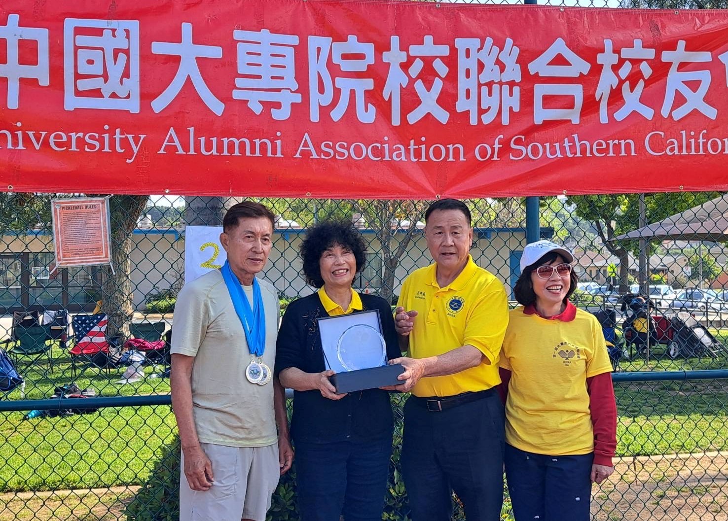 南加州中國大專院校聯合校友會於4月20日(六)上午,在蒙特利公園市巴恩斯公園匹克場舉辦台灣海外大專院校聯盟首届匹克球(Pickleball)聯誼大賽,來自15所台灣高校的匹克球好手同場競技,42所大學校友會共襄盛舉,4個賽場共5小時賽事以友誼與良性競爭雙贏完美落幕。男雙、女雙、男女混雙以及各種親子比賽輪番登場;場外的啦啦隊也給與每個好球熱烈掌聲,場上場下活力四射。當日天公作美,和風吹拂、涼快清爽。比賽召集人陳麗華表示,當天不僅是比賽的好天氣,也是校友們聯誼的好時光,來自南加州各地將近70位匹克球愛好者參加比賽,他們中有年過八旬的運動好手,也有匹克球的推廣先進,最小選手只有12歲。她感謝大家踴躍參與,特別感謝十多位校友捐款支持比賽。