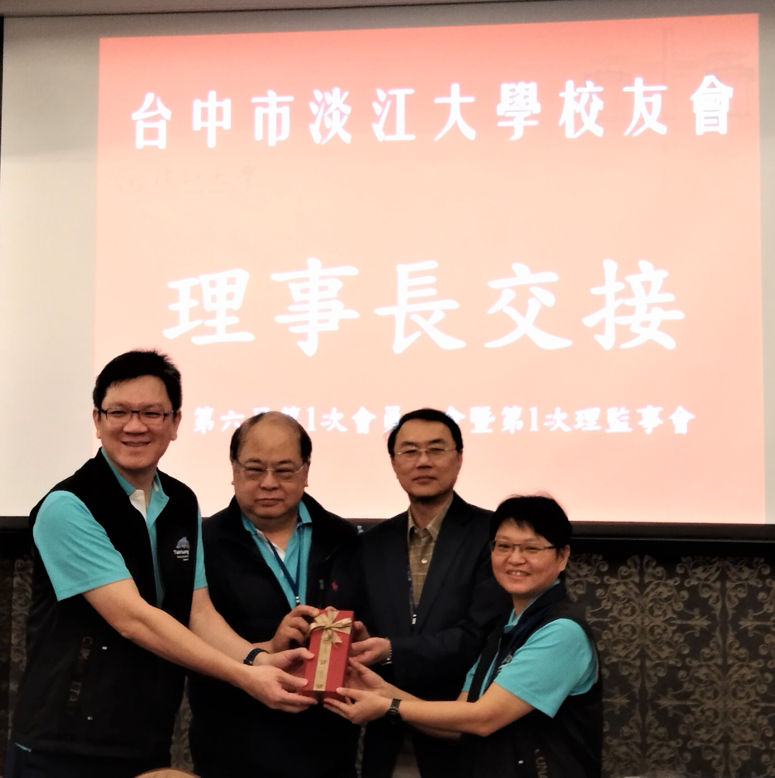 ◎台中市校友會新舊理事長交接由中華民國校友總會總顧問林健祥(左2)及行政副校長林俊宏(左3)監交,左1為理事長林亮宇,右1為新任理事長李明娸