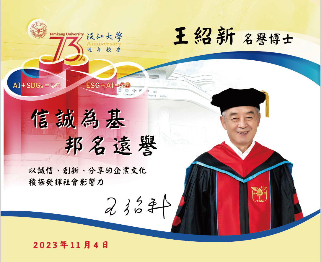 ◎数学系王绍新学长社会贡献良多 荣获母校名誉博士本校于11月4日(六)举行73周年校庆庆祝大会,由商管学院杨立人院长推荐,葛焕昭校长颁授名誉博士学位证书予信邦电子股份有限公司董事长,数学系校友王绍新学长,并致赠文锱艺术中心主任张炳煌书写的「绍学导新」墨宝。