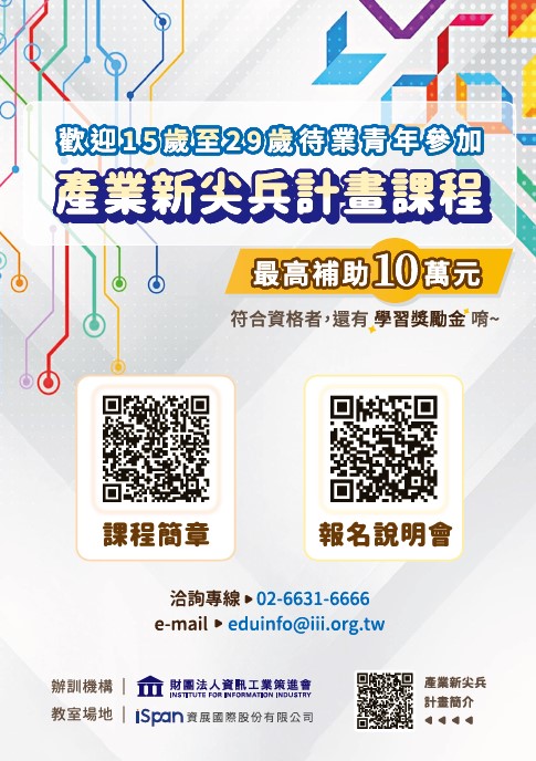 資策會「產業新尖兵計畫」訓練課程,簡章及說明詳說明及海報QRcode。 2025-09-10 雷菊仙 說 明: 勞動部為鼓勵15歲至29歲之本國籍待業青年,培養產業人才關鍵技能,並協助青年追求理想職涯及就業即戰力,提供旨揭訓練課程。 訓練課程,最高補助10萬元訓練費用;符合條件者,另可申請每月8,000元學習獎勵金,最高累計9萬6千元。 旨揭計畫及補助於資策會臺北、臺南及高雄等地辦理。 洽詢專線:02-6631-6666;e-mail:eduinfo@iii.org.tw 相關網址: 計畫簡介:https://elite.taiwanjobs.gov.tw/eNews/Detail?EN_ID=1 課程簡章:https://reurl.cc/ZNMeQW 課程說明會報名:https://reurl.cc/ZNMeGM